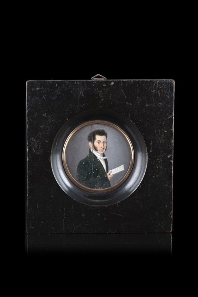 "Ritratto di gentiluomo con lettera in mano" miniatura tonda (d. cm 5) Firmata a destra e inscritta sulla lettera "Pour Mm.me Antini gage d'amitiè" (difetti)