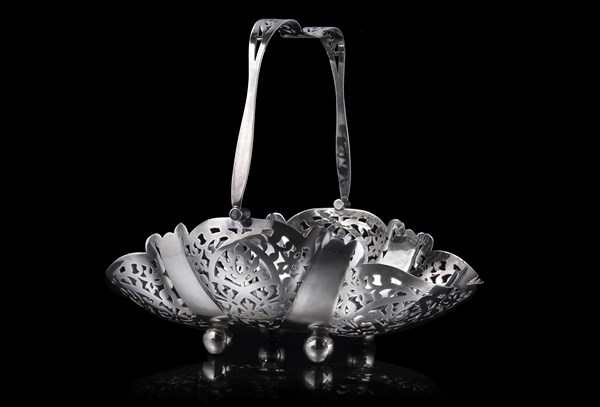 Cestino con manico di forma mossa in argento traforato a motivi stilizzati, poggiante su quattro piedini a sfera. Punzoni di Birmingham, 1912. Argentiere T. Wooley (cm 25x10x17,5) (g 640)