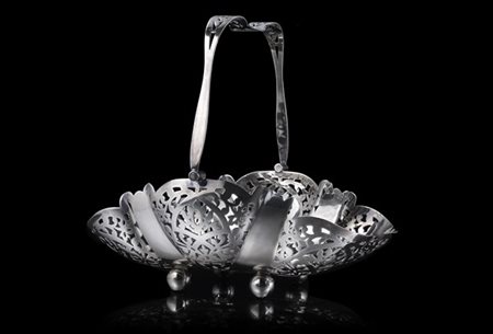 Cestino con manico di forma mossa in argento traforato a motivi stilizzati, pog