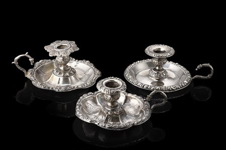 Lotto di tre bugie in argento di diverso decoro del secolo XIX, due con punzoni
