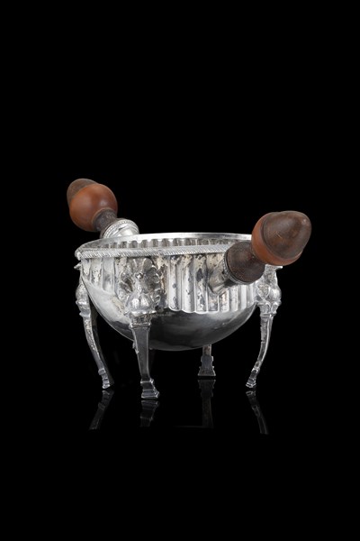 Salsiera a barca in argento con fascia scanalata e decorata. Gambe squadrate e cesellate all'attacco a pavoni. Prese in legno tornito a ghianda. Genova, punzone Torretta 1799. Argentiere non identificato (g lordi 190)