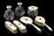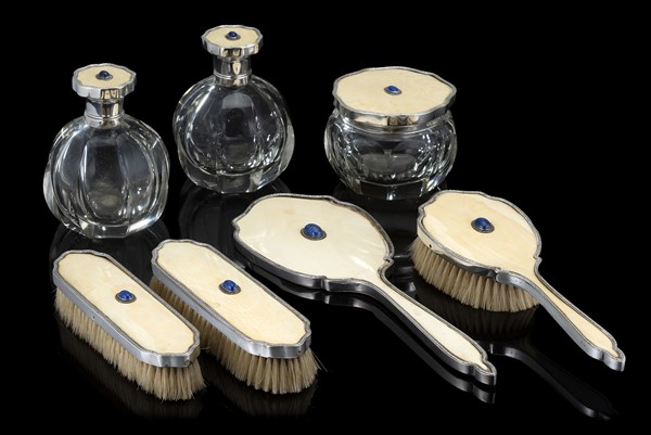 Servizio da toilette in argento, vetro e avorio con cabochon in lapislazzulo composto da una scatola portacipria, due bottiglie portaprofumo, tre spazzole e uno specchio. Titolo 800 (difetti)