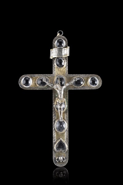 Lotto 1049 | Crocifisso in argento e vermeille con croce decorata da inserti in cristallo di