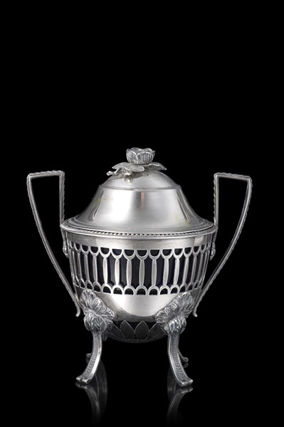 Zuccheriera biansata in argento traforato, anse squadrate e presa del coperchio