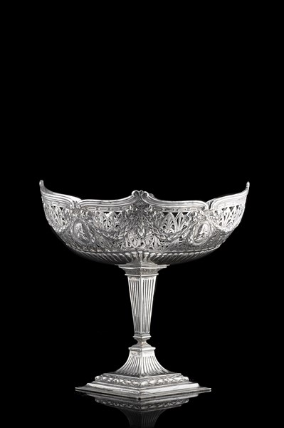 Alzata in argento, fascia traforata decorata a ghirlande e mascheroni sorretti