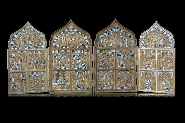 A 19th-century quadripartite travelling four-panel bronze and enamel icon (cm 18x11 closed; cm 18x42 opened) (defects and losses)