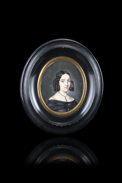 "Ritratto di dama in abito nero 1843" miniatura ovale (cm 7x5,5) Firmata e datata al retro sul cartoncino. In cornice