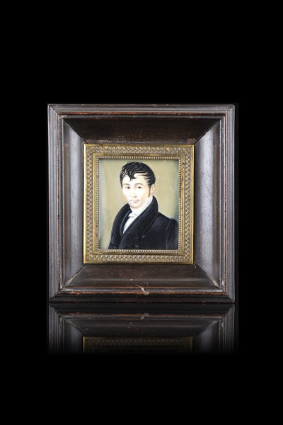 Ignoto del secolo XIX "Ritratto di gentiluomo in giacca blu" miniatura rettango