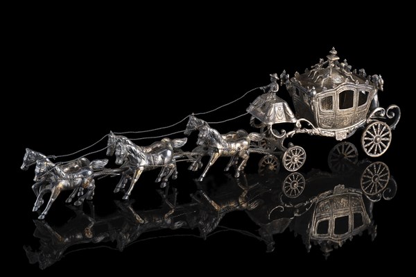 Composizione a tutto tondo raffigurate una carrozza con cocchiere e tiro a sei in argento sbalzato e cesellato. Punzoni di Chester, inizio secolo XX (cm 25x5,3x4,7) (g 265) In custodia originale dell'Argenteria Broggi di Milano (difetti)