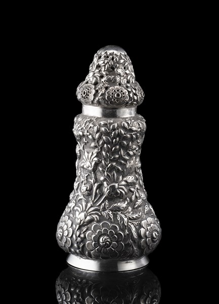 Spargizucchero in argento sbalzato a fiori e foglie. Londra 1888. Horace Woodward & Co - Edgar Finley & Hugh Taylor (h. cm 22) (g 240)