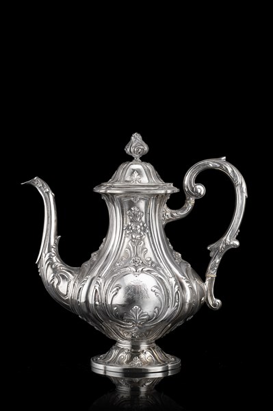 Teiera in argento a corpo sbalzato a fiori e inciso a stemma coronato tra due leoni. Presa mossa. Francia, secolo XIX. Argentiere non identificato (h. cm 26) (g 750)