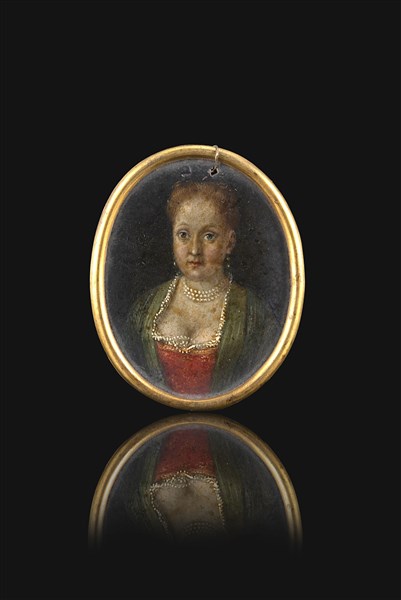 A 17th century Northern Italian School "Portrait of a lady with a pearl necklace" oil on copper (6.6x5 cm) (defects)