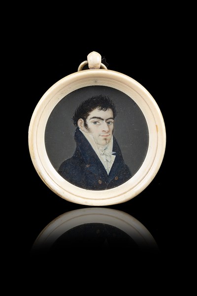 Monogrammista G.P., secolo XVIII/XIX "Ritratto del musicista Luigi Cherubini" miniatura tonda su avorio (d. cm 5,5) Inscritta e siglata sul cartoncino al retro. In cornice coeva in avorio
