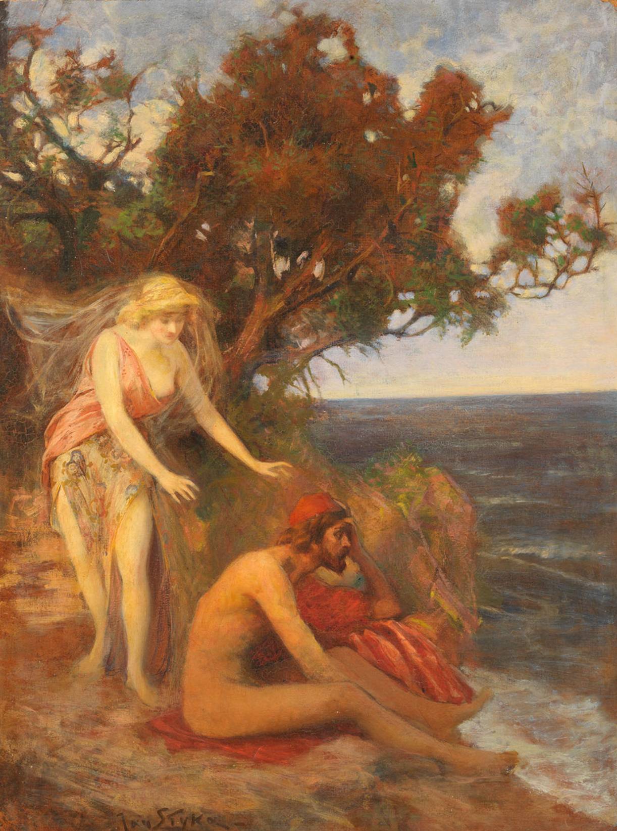 Jan Styka(Lemberg 1858 - Roma 1925)CALIPSO ED ULISSEolio su cartoncino, cm...