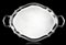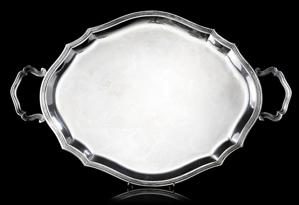 Vassoio biansato in argento liscio a bordo mistilineo scanalato, anse a volute.