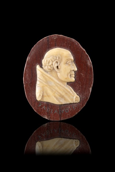 Antico altorilievo in alabastro raffigurante Fabiano I, montato su pannello ovale in porfido inciso con il nome dell'effigiato (cm 8x6) (difetti)