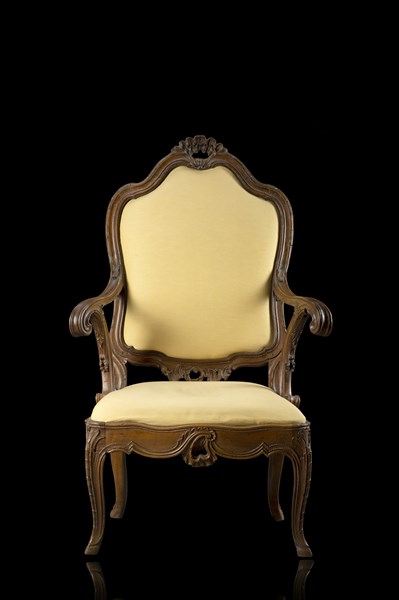 Poltrona in noce intagliato di forma mossa, schienale sormontato da conchiglia traforata, braccioli terminanti a ricciolo, gambe sagomate, piedi ferini. Secolo XVIII (cm 88x143x49) (difetti e restauri)