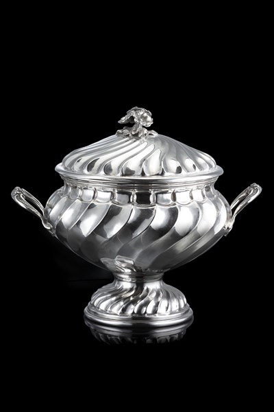 Zuppiera biansata in argento costolato e decorata a torchon. Anse cesellate a volute e motivi fioriti. Presa del coperchio a mazzo di fiori in rilievo. Titolo 800, Milano (cm 30x27) (g 1170)