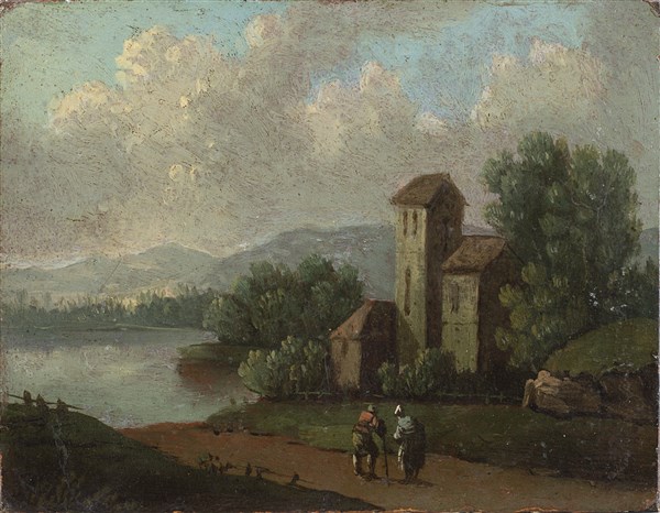 Scuola dell'Italia settentrionale, secolo XIX Paesaggio lacustre con figure Ol