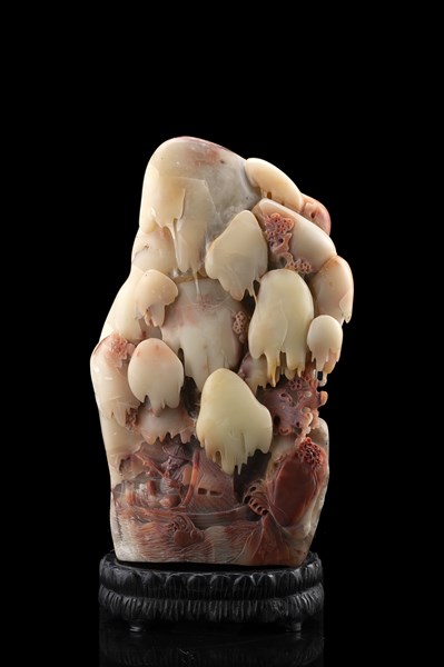 Montagna in giada scolpita con pescatore su imbarcazione tra motivi vegetali, base in legno.