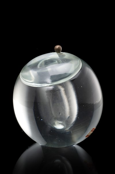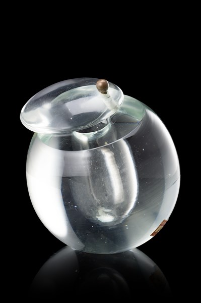 Calamaio in vetro massello incolore e ottone modello numero 6512. Murano, 1940. Recante etichetta cartacea originale (h. cm 11)