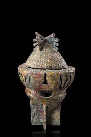 "Il riso in bocca" potiche/scultura in ghisa rivestita in cemento modellato a rilievo e dipinto in azzurro, rosso, celeste, verde, giallo su fondo beige. Biella, 2009. Firmata e datata alla base (h. cm 54 x d. cm 35) (lievi difetti)