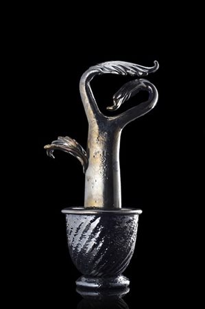 "Pianta grassa" scultura in vetro pulegoso blu scuro opaco fortemente iridato sulla superficie esterna. Anni '90ca. Recante due etichette adesive Venini sul fusto e sotto la base (h. cm 32)
