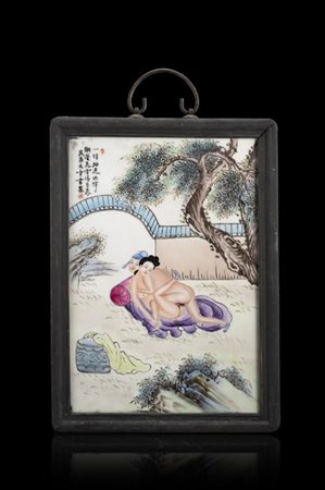 Placca in porcellana a soggetto erotico datata 1917, in cornice. Cina, secolo
