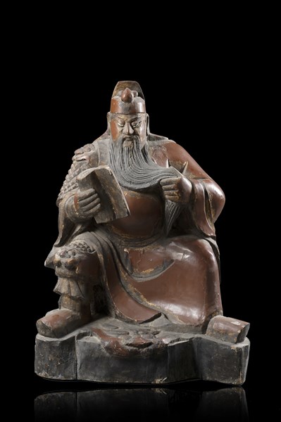 Figura di saggio assiso reggente manoscritto in legno laccato, con tracce di doratura. Cina, secolo XIX