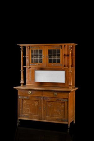 Credenza Liberty a doppio corpo in legno. Parte inferiore a due cassetti sottopiano e due sportelli decorati da motivo fiorito, parte superiore ad alzata centrata da specchio, montanti intagliati con papaveri, due vani laterali e due ante con risguardi in vetro molato. Guarnizioni e maniglieria in ottone (cm 152x201x61) (difetti)