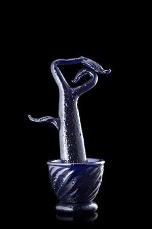"Pianta grassa" scultura in vetro pulegoso blu opaco. Anni '90ca. Recante due etichette adesive Venini sul fusto e sotto la base (h. cm 29)