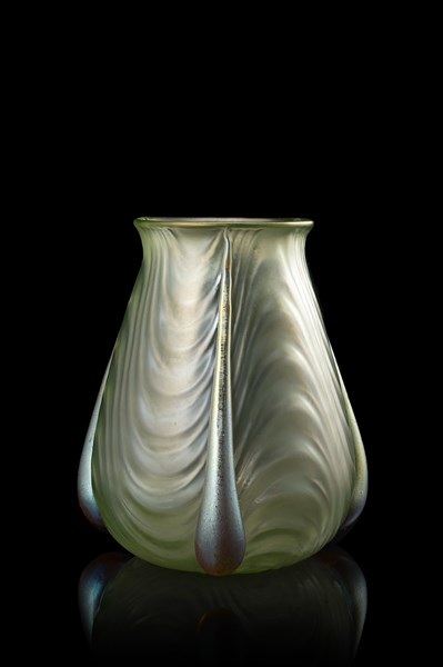 Transparent light green glass vase with festooned ribbed body and three drops applied in strongly iridescent orange glass on the external surface. Austria, 1920s. (h 22 cm.)