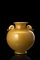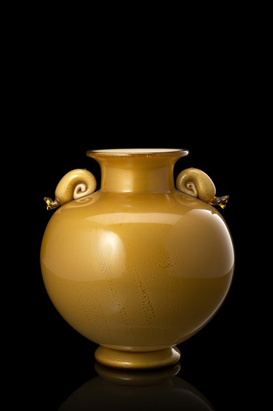 Vaso biansato in vetro soffiato incamiciato lattimo e pagliesco con applicazione di foglia d'oro. Anse a forma di chiocciola e base applicata a caldo. Seconda metà secolo XX (h. cm 27)