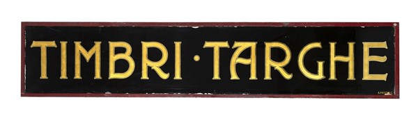 Vetrofania con inscrizione dorata "timbri e targhe" (cm 290x55) Inizio secolo XX (difetti)