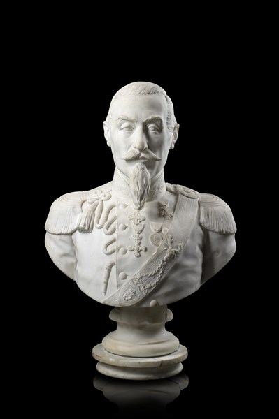 "Ritratto di Ettore de Sonnaz" busto in marmo bianco (h. cm 72) Firmato al retro (difetti)