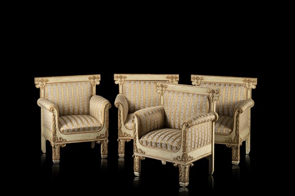 Quattro poltrone da centro in legno laccato e dorato con schienale di forma squadrata decorato a rosoni, braccioli mossi intagliati a foglie d'acanto e riccioli, piedi a plinto. Secolo XIX (cm 85x97x57) (difetti)
