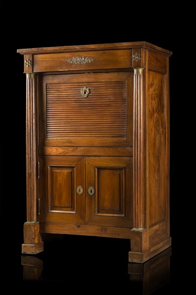 Secretaire in mogano a un cassetto e un'anta scanalata celante scarabattolo architettonico, montanti a colonna con capitelli dorati (cm 96x146x64) Secolo XIX (difetti)