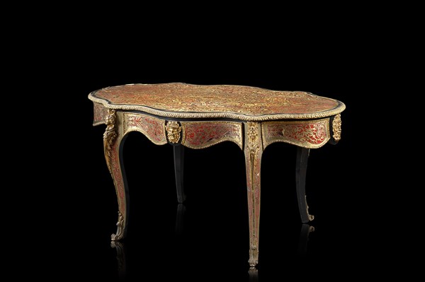 Tavolo di forma mossa in stile "Boulle" in legno ebanizzato, intarsiato e lastronato a finta tartaruga e ottone a volute e fiori, un cassetto sottopiano, fascia e gambe decorate da fregi e mascheroni in metallo dorato (cm 153x78,5x88) (difetti e mancanze)