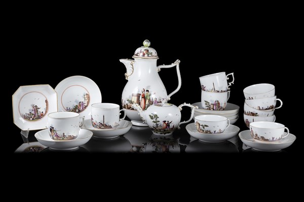 Manifattura di Meissen, secolo XVIII/XIX. Parte di servizio in porcellana bianca decorata a figure e scene portuali in policromia, profilata in oro. Composto da: caffettiera, teiera, dieci tazzine diverse con nove piattini circolari e uno ottagonale. Tra cui sei tazzine e nove piattini marcati "K", caffettiera marcata "L" in magenta (mancanze e restauri)