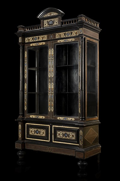 Vetrina in legno ebanizzato, lastronato in legni vari, filettato e intarsiato in avorio. Fronte a due ante a vetri e due sportelli, decorato a raffaellesche e inserti in lapislazzuli. Montanti a colonna a tutto tondo. Cappello di forma architettonica decorato da colonnine in avorio. Piedi "a cipolla". Lombardia, fine secolo XIX (cm 125x226x50) (difetti e mancanze)