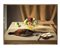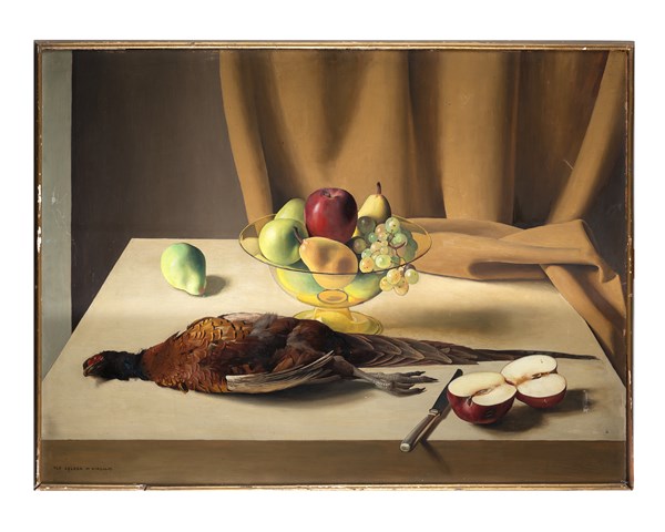 "Composizione con frutta e fagiano" olio su masonite (cm 70x100) Al retro: "Vele". In cornice