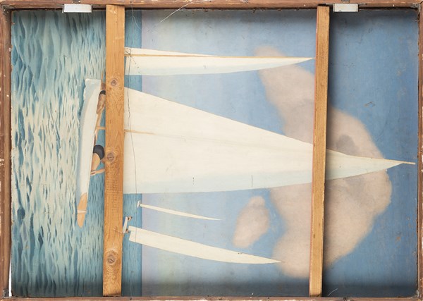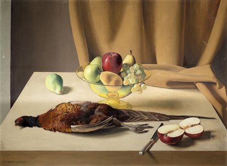 "Still life with fruits and pheasant", oil on hardboard (cm. 70x100). On back: "Sails". In frame