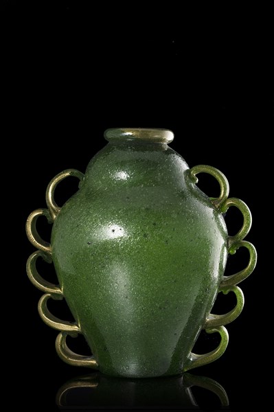 Grass green pulegoso blown glass vase decorated with a sequence of ten ribbed handles. Application of gold leaf on handles and applied edge. 20th century. (h 36.3 cm.) (defects and restorations)