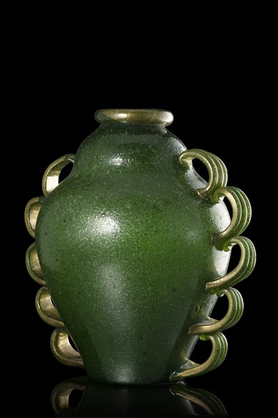 Vaso in vetro soffiato pulegoso verde erba decorato con una sequenza di dieci anse a nastro costolate. Applicazione di foglia d'oro sulle anse e sull'orlo applicato a caldo. Secolo XX (h. cm 36,3) (difetti e restauri)
