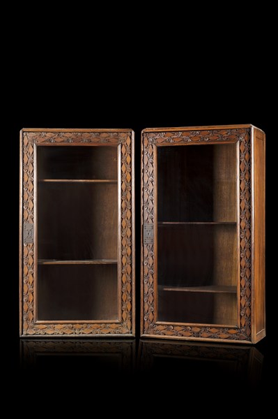 Coppia di vetrine in legno di rovere massello con fronte a fasce intagliate a motivi romboidali e a volute fortemente geometrizzate. Bocchette in ferro battuto. Milano, 1912-1915 (cm 99x180x49) (lievi difetti)
