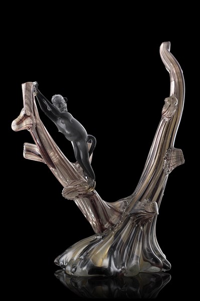 "Scimmia su albero" scultura in vetro sommerso costolato trasparente incolore con canne ametista e inclusione di foglia d'oro, scimmia in vetro nero a fitte bollicine con effetto "fumato". Anni '40 (h. cm 43,5) (difetti e restauri)