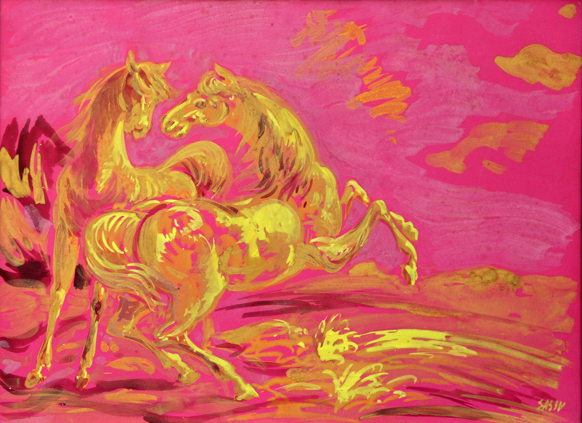 SASSU Aligi, I cavalli d'oro, 1964, tempera su cartoncino, cm. 47.5 x 67.5. Autentica a cura della Fondazione Sassu, con n. 64TEL60. . Provenienze:Galleria d'Arte l'Idea, Occhiobello Note:Firma "Sassu" (in basso a destra)