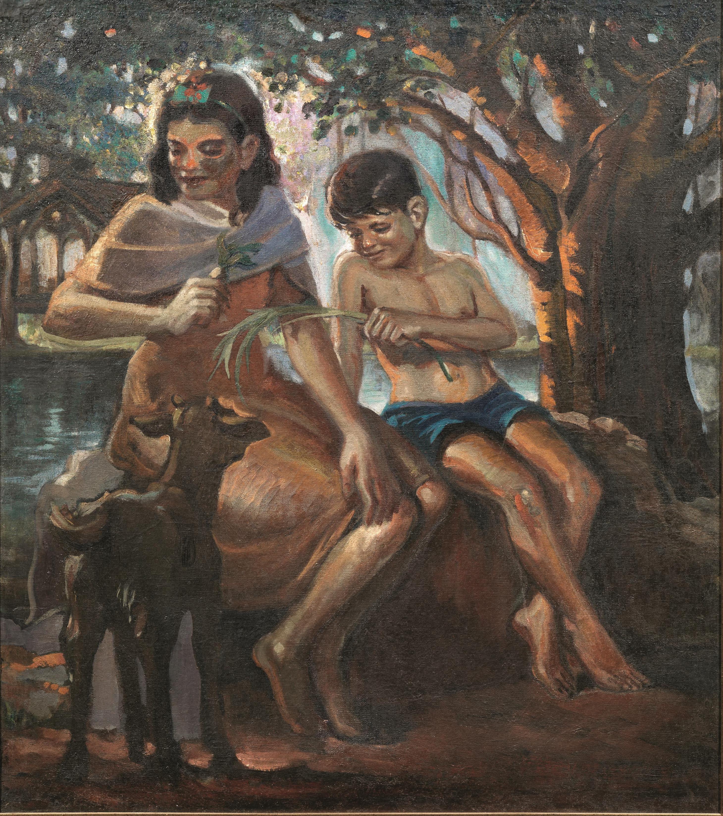 Scuola del sec. XXFANCIULLA CON BAMBINO E CAPRETTAolio su tela, cm 95x84