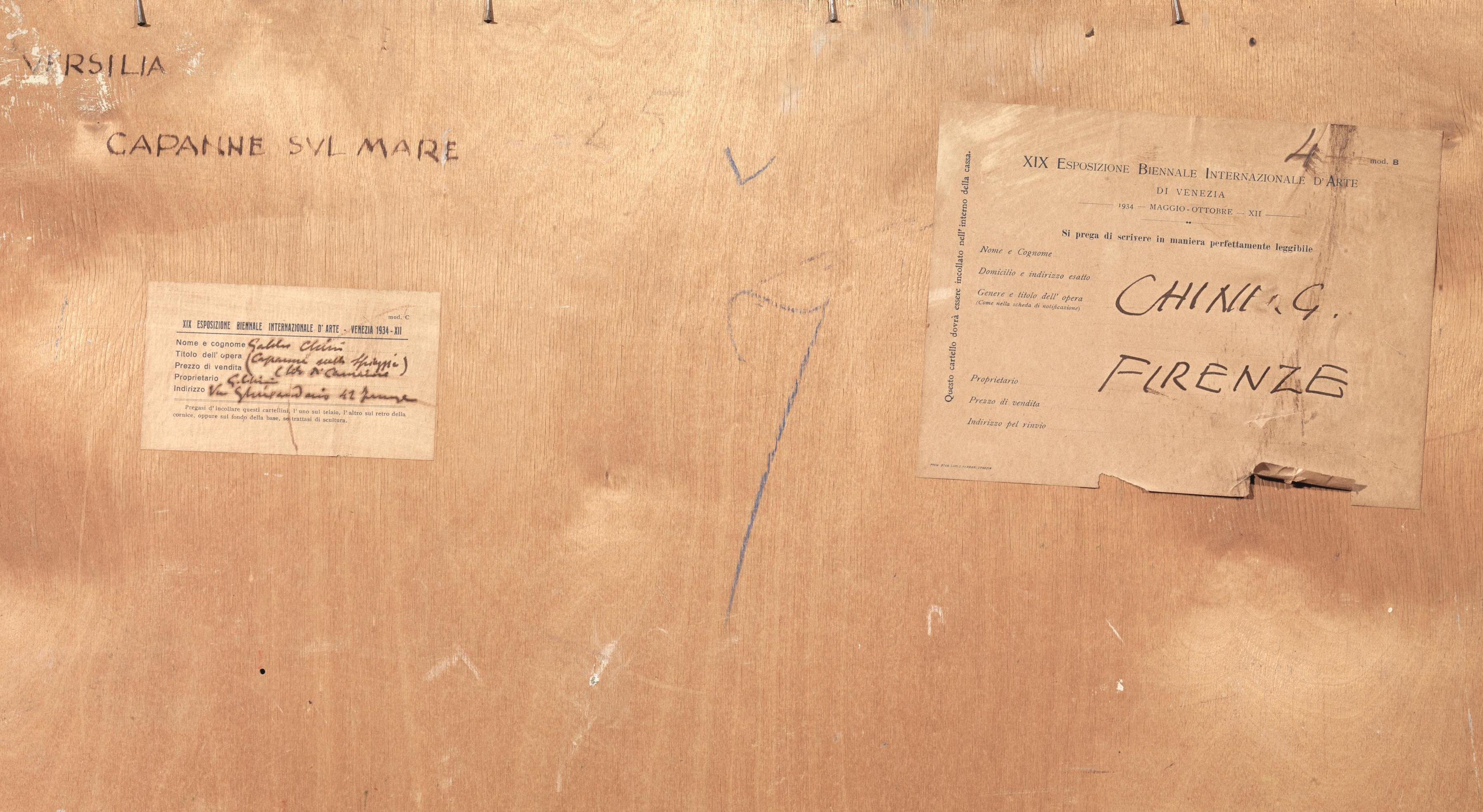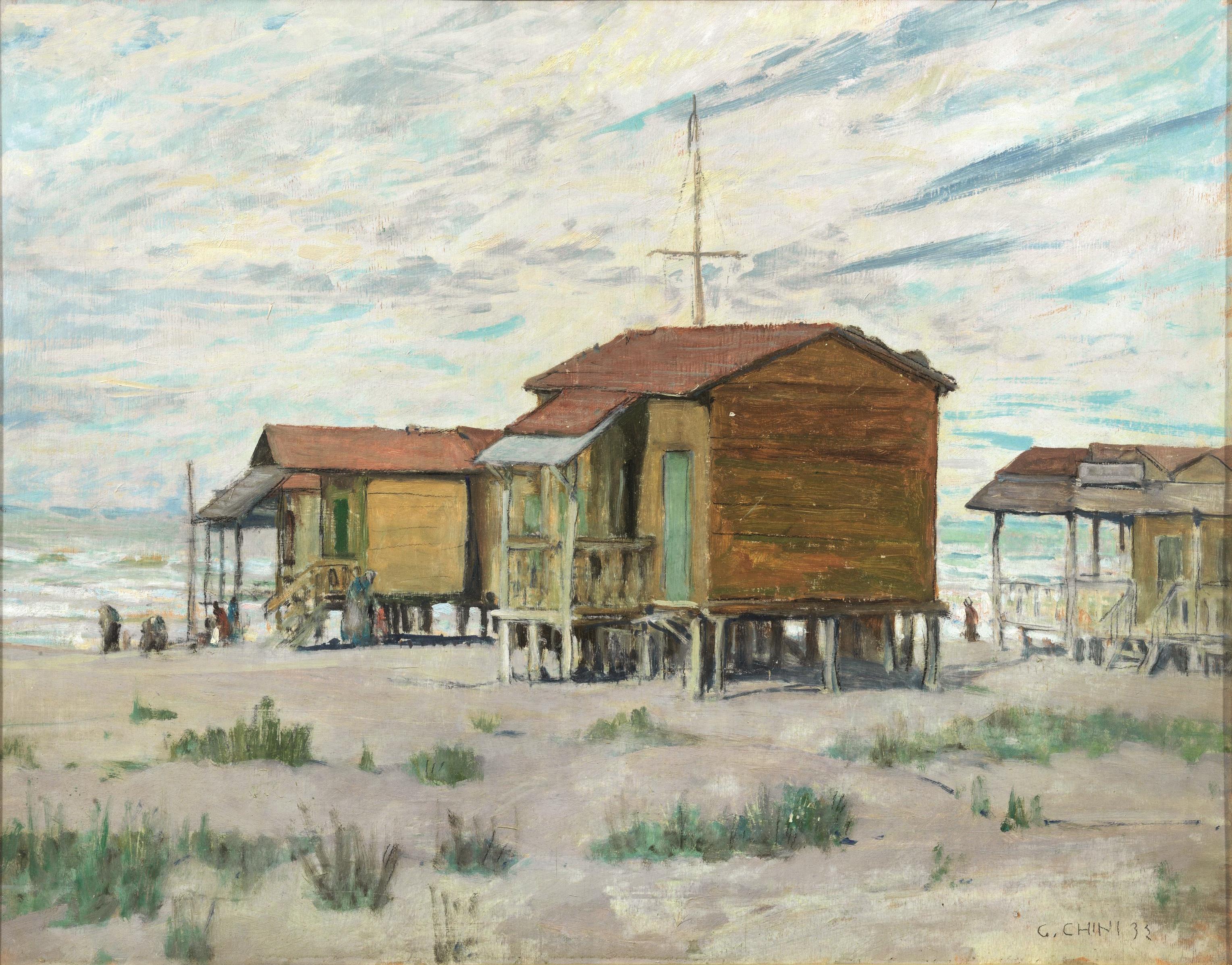 Lotto 378 | Galileo Chini(Firenze 1873 - 1956)SPIAGGIA CON CAPANNE DI PESCATORIolio su...