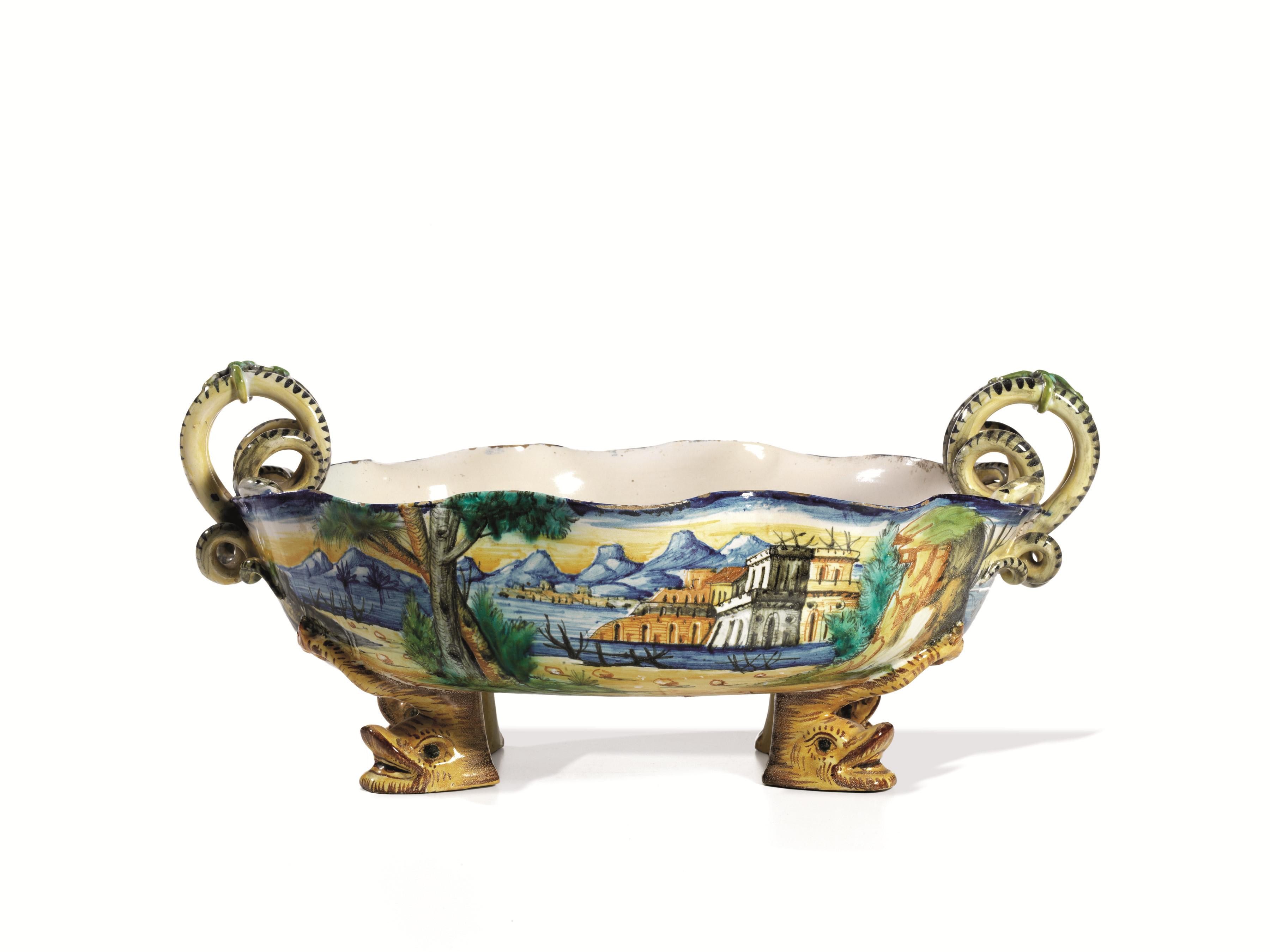 Coppa centrotavola, manifattura Cantagalli, fine sec. XIX, di forma ovale sagomata in maiolica decorata a paesaggi e putti in policromia, anse serpentiformi, quattro piedini modellati ad animali acquatici, cm 41x28, lievi sbocconcellature